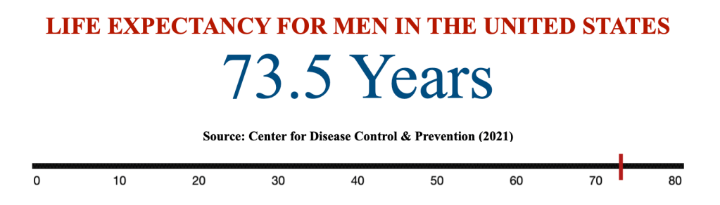 As the graphic above clearly indicates, according to the United States Center for Disease Control & Prevention in 2021, the average life expectancy for an American male is 73.5 years. It’s important to acknowledge that this number is the average life expectancy, so many men live considerably longer.
