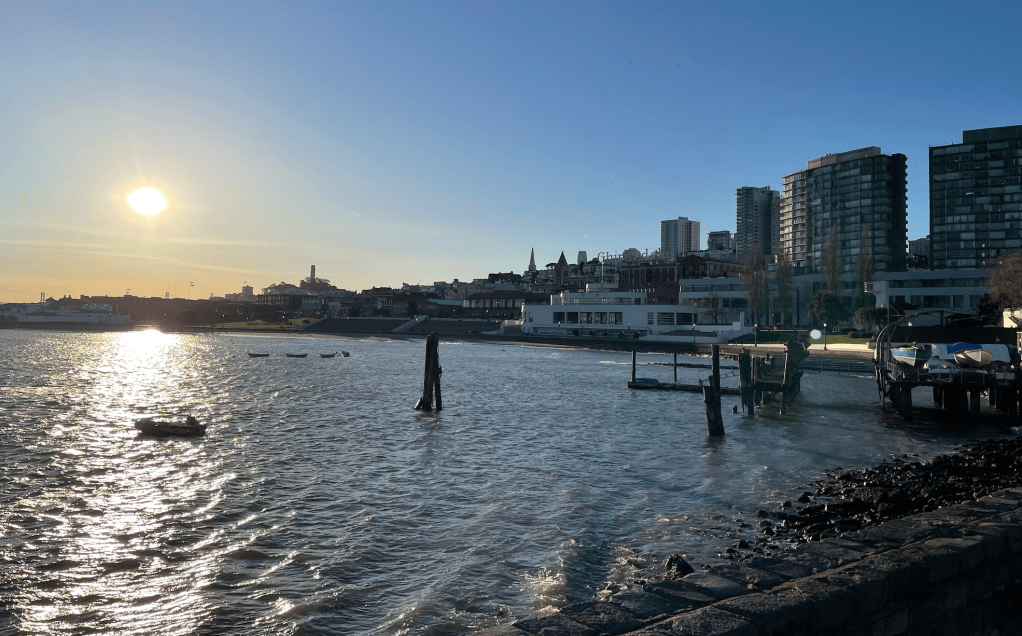 As I stood at the end of Van Ness Avenue looking out over Aquatic Park, I couldn’t help but think of the words of Journey’s signature song Lights. Of course, I had to adjust the words to reflect the time of day, but in my mind I was singing:
