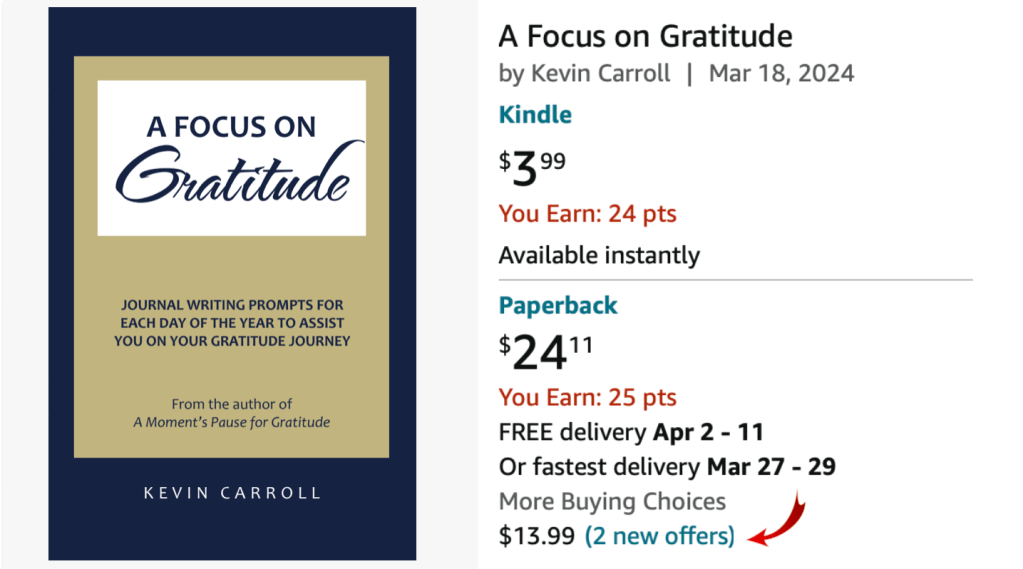 As some of you may have noticed, my new book, A Focus on Gratitude, is incorrectly priced on Amazon. Actually, Amazon tells me that it’s not mis-priced. Rather, the selling price of $24.11 is not a purchase from Amazon. They allow third-party sellers on their site and this outrageous price is being offered by All Time Fans, not Amazon.