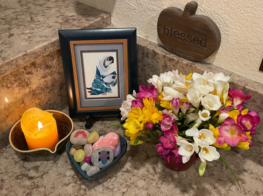 Kathy included some flowers, a collection of rocks, a candle, and a framed painting for the sacred space in the kitchen. When preparing meals, Kathy lights the candle and is reminded of the presence of the sacred in the ordinary.