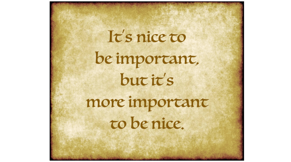 In my retirement, I have enjoyed a very different approach to life. Hardly a day passes that does not offer me multiple opportunities to be nice to people. Walking through the mall, in my neighborhood, or even in The City, I make it a point to greet people, establish eye-contact, and, when possible, strike up a conversation. I also look for opportunities to help people with small tasks — picking up something that had been dropped, holding a door open, helping someone to cross a street safely, or keeping an eye on a stray child until he is reunited with his parent. These are simple things I can do to make a positive contribution to the world. I may not remember all the things I do for others, but I’m guessing that the recipients of my kindness might remember them longer than I do.