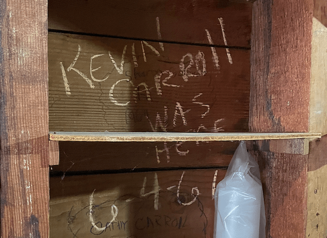 Much to my surprise, the garage door opened just as I arrived at the house. The current resident, along with his young son, was just getting ready to go somewhere. I stopped, introduced myself, and asked if I might check to see if my writing was still on the garage wall. He had not noticed it previously, but we ventured inside to check it out. A tall, narrow cardboard box leaning against the wall obscured our vision of the area where I’d written the message. The resident moved the box. I think he was more surprised than I that what I’d written almost sixty years ago was still there.
