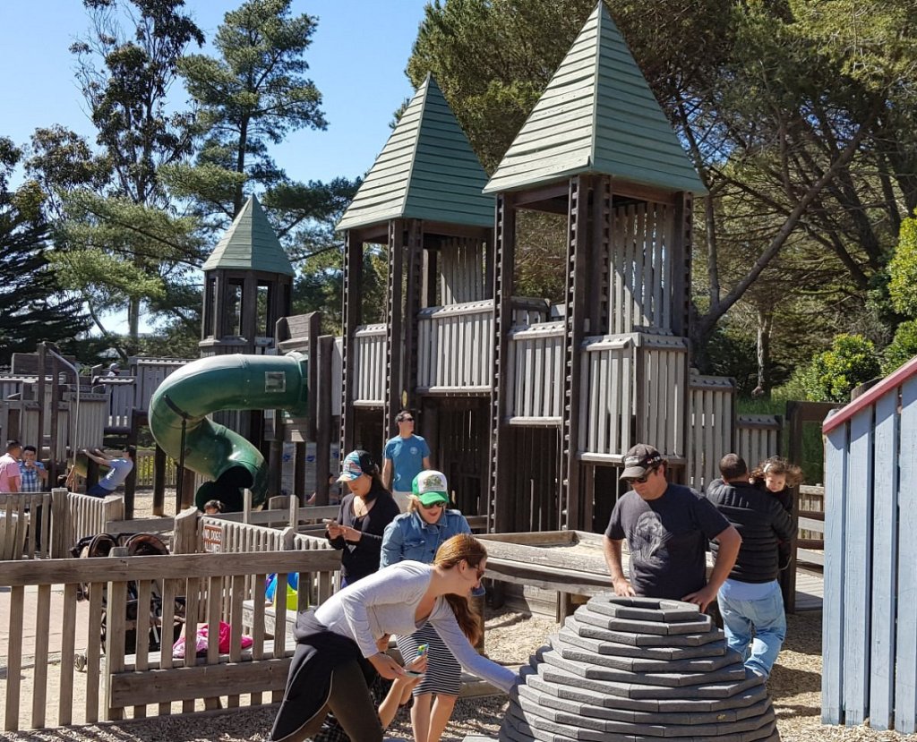 Now, as a grandparent, “the cousins getting together” has taken on a whole new meaning. Our sons’ generation has produced nine grandkids so far, five for Kathy and me, and four for Jim and Peggy. Today was an opportunity to get them (most of them, anyway) together for a picnic at Frontierland Park in Pacifica. The sun was shining, the temperature was comfortable, and the kids had a blast!