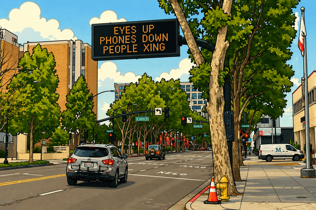 It happened again on Tuesday morning. I was stopped at a traffic light behind a young woman whose head was down while the stoplight was red. I can only assume she was texting, because when the light turned green, her head did not move… nor did her car. A quick toot of my horn got her to look up, at which time she accelerated sharply and sped up to the next intersection. Again, the light was red, and again, she looked down at her phone. Ironic, since I had snapped the image above at about 7:30 that morning in downtown San José.